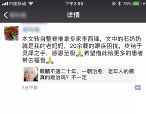 为老年人诊治时,不要被年龄大、时间长、曾多处多次治疗无效之类阻力吓倒。只要耐心检查,深入思考,治疗过程当中注意安全操作,他们不见得就比年轻人恢复得慢了。 如果有年老病患前来求助,还请多替这些八十岁以上的老年人思考,找准病因,解除病痛。愿与诸位同道共勉之。 后续 ▲本医案在【灵犀之手】首发之后,患者的女儿转发了此篇文章以及朋友圈的分享。 —— 作者简介 ——
